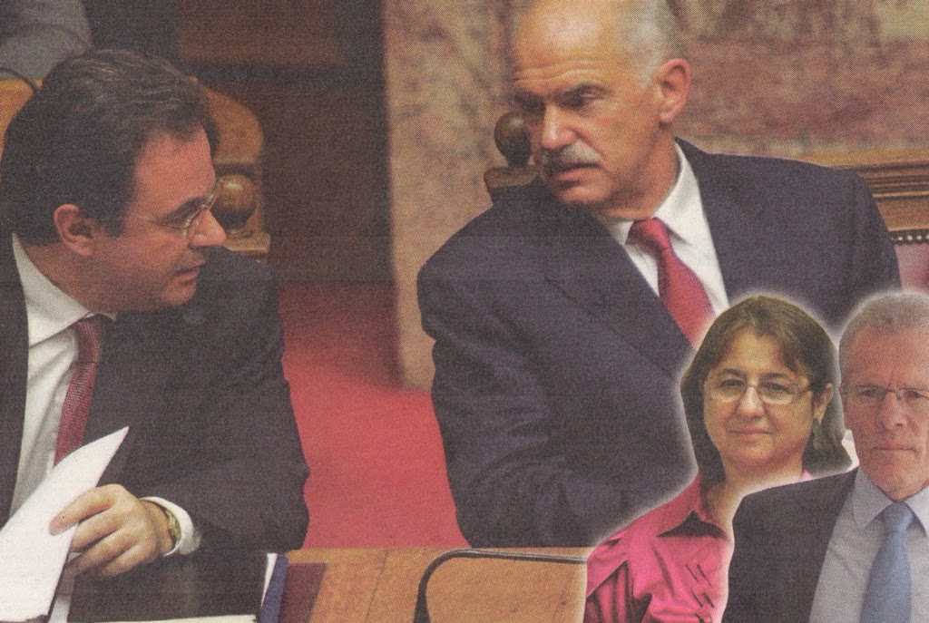 Ο τέως πρωθυπουργός Γιώργος Παπανδρέου με τον υπουργό Περιβάλλοντος (και πρώην Οικονομικών) Γιώργο Παπακωνσταντίνου. Ένθετες φωτό: Ο εισαγγελέας Γρηγόρης Πεπόνης (δεξιά) και το πρώην στέλεχος της ΕΛΣΤΑΤ. Ζωή Γεωργαντά.